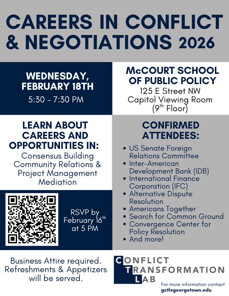 Join the Conflict Transformation Lab (CTL) for an event exploring a wide range of jobs in conflict resolution, facilitation, and negotiation. Meet practitioners with experience in international organizations, U.S. government agencies, and non-governmental entities. Learn about skills, challenges, and opportunities while making connections with senior leaders in the field.